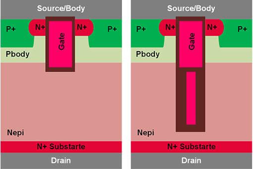 CoolSemi的SGT-MOSFET功率器件采用超深溝槽設(shè)計(jì),屏蔽柵于源極短接,屏蔽掉了大部分Qgd電荷,大大降低器件的米勒電容,有效提升器件的開(kāi)關(guān)速度,開(kāi)關(guān)損耗更低,溝槽深度加深降低導(dǎo)通電阻,導(dǎo)通損耗更低。